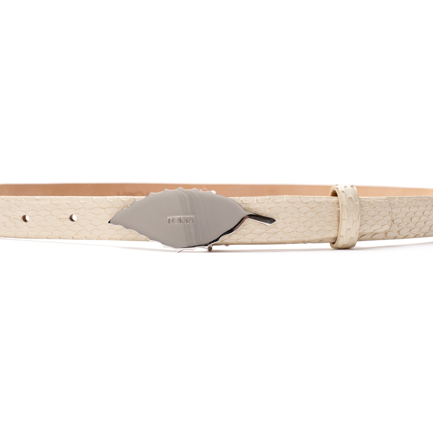 La cintura AMUR 20 mm. realizzata in preziosa pelle di pitone, rifinita da fibbia metallica argentata arricchita da dettaglio a foglia con logo TOMA. Made in Italy.