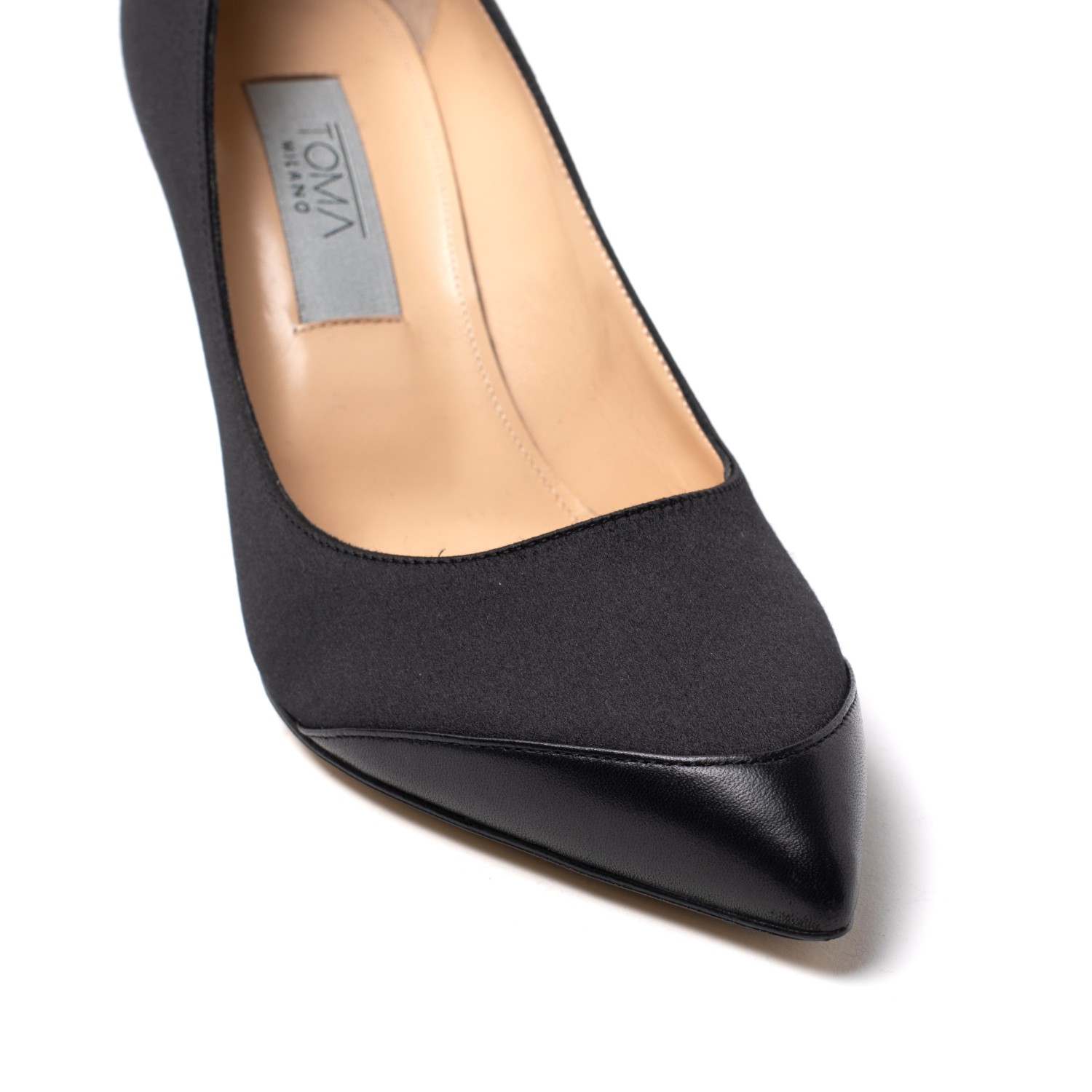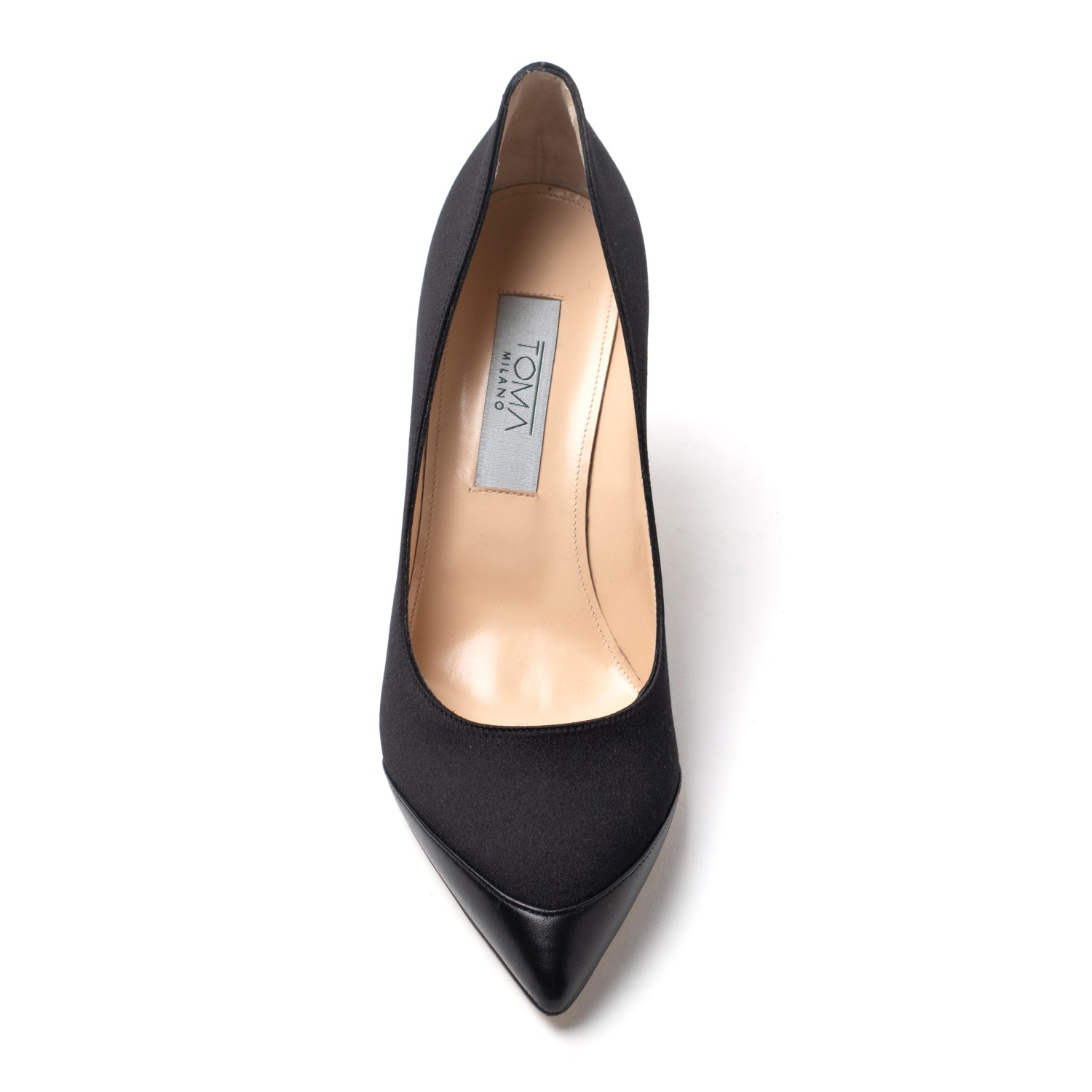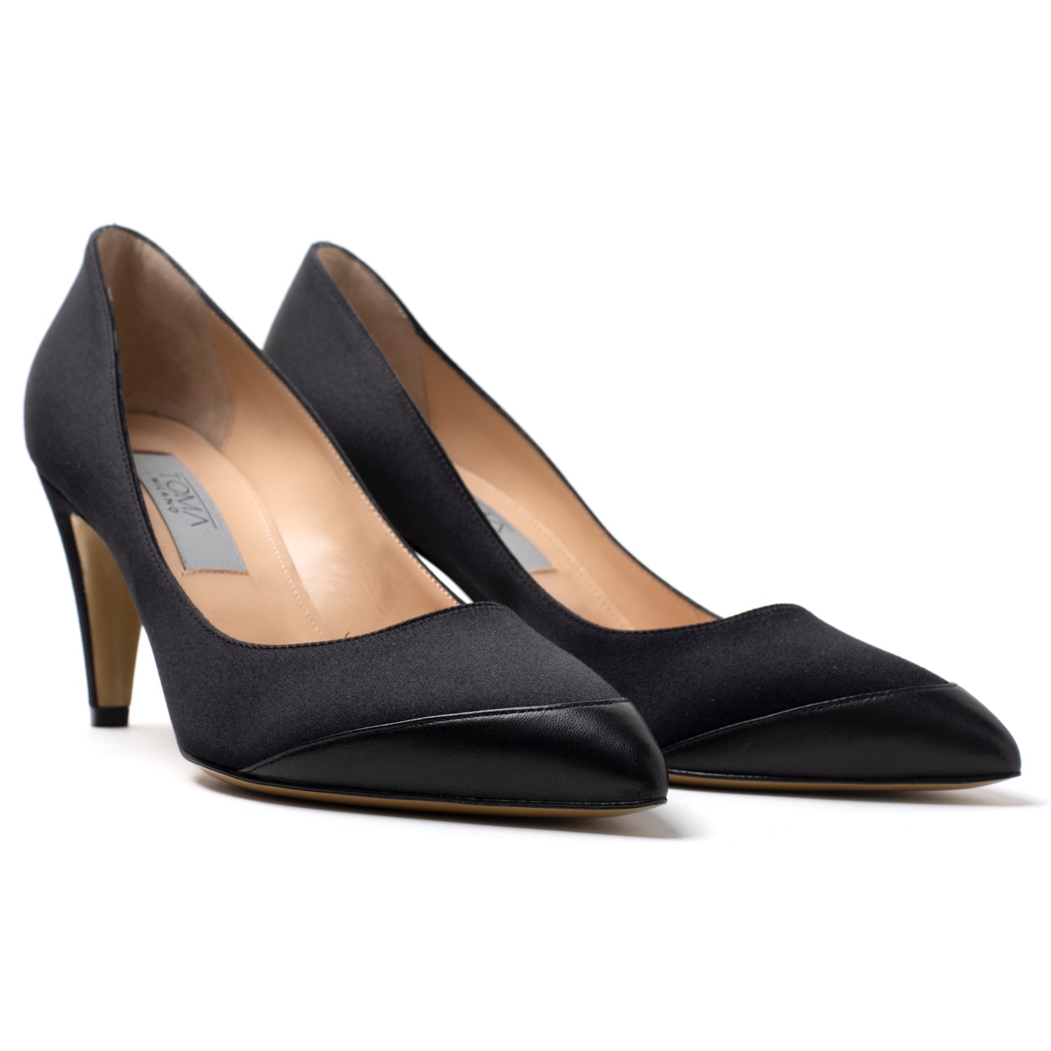 Décolleté che si distingue per la combinazione di raso e nappa. L’originale modello è impreziosito da un decoro di 3 cristalli Swarovski taglio piramide applicati sul tallone. La punta ricoperta in nappa. Caratterizzata da un tacco medio. Made in Italy