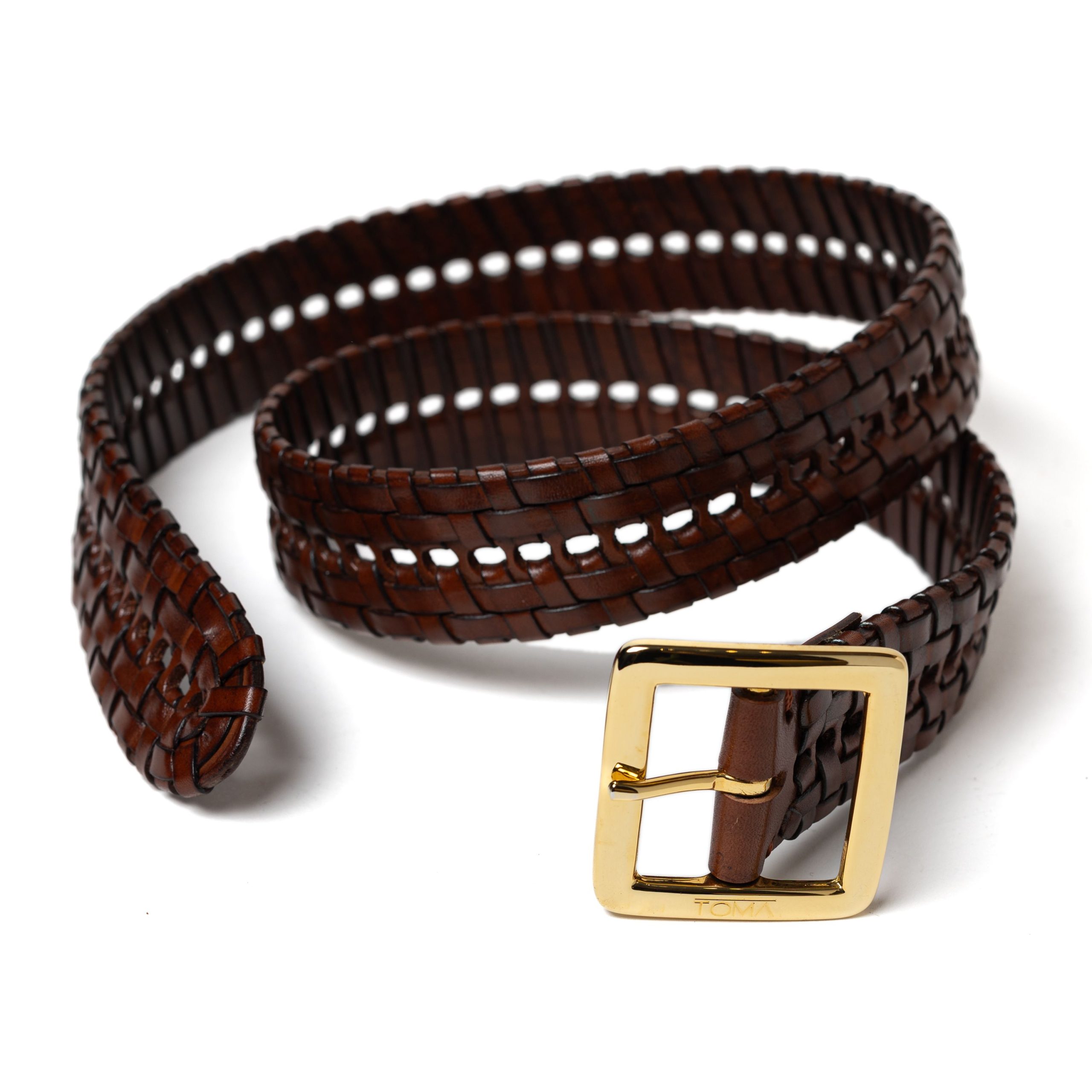 Cintura in pelle di vitello intrecciata e colorata a mano, impreziosita da una fibbia quadrata in finitura oro con logo TOMA inciso. Un accessorio che rappresenta l’epitome del savoir-faire artigianale italiano. Made in Italy.