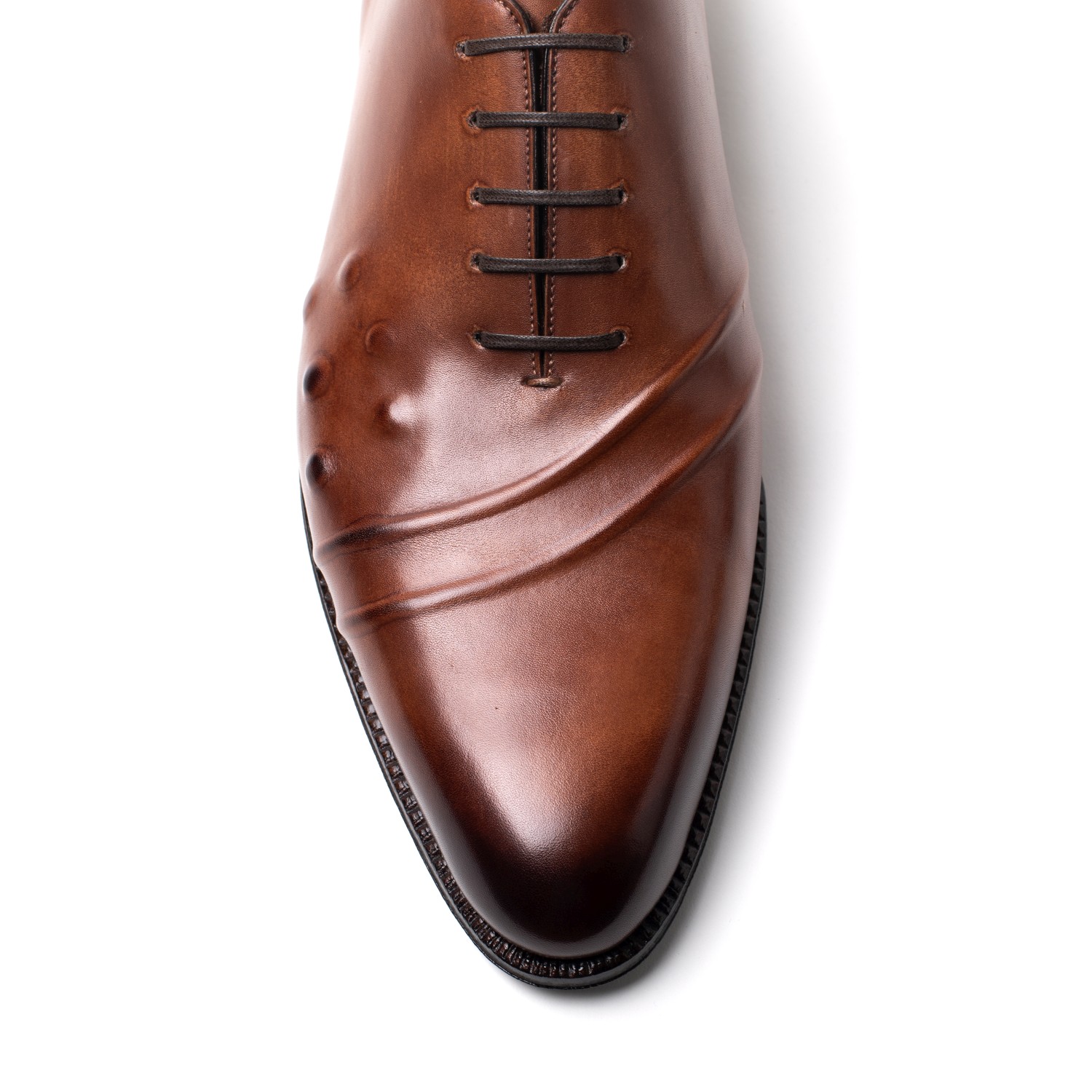 Modello oxford è proposta in pelle di vitello anticata e lucidata a mano nelle tonalità del colore cognac. Dettagli sotto pelle che richiamano i tatuaggi che decorano i corpi degli abitanti nelle tribù in Etiopia. Ispirato a uno dei temi simbolici della Collezione Uomo della stagione. La calzatura stringata dalla forma elegante e allungata è presenta una suola in cuoio. Made in Italy.