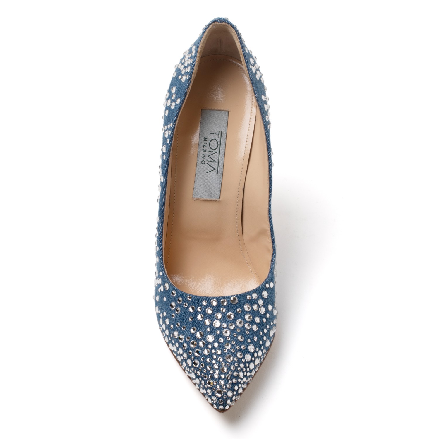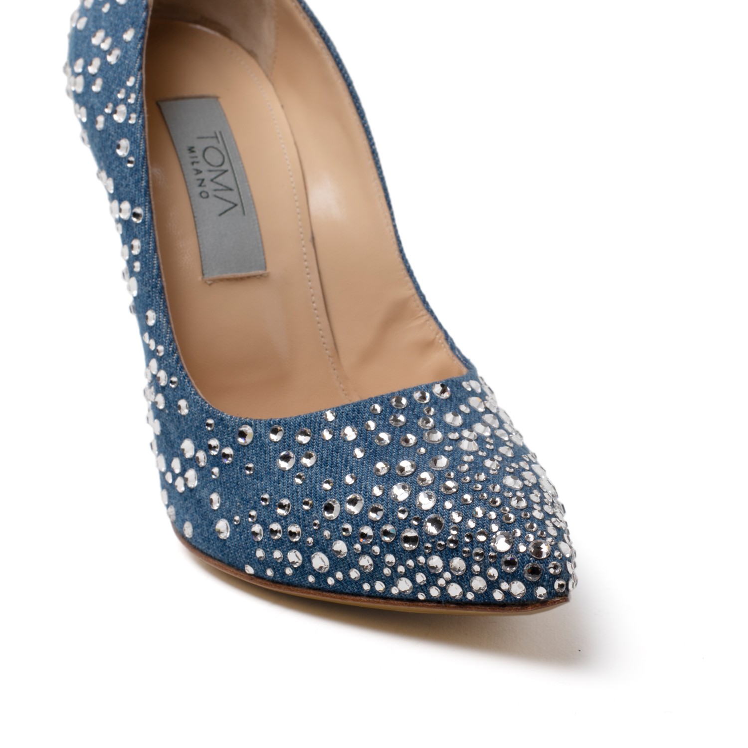 L’iconica décolleté urban rock della Maison TOMA adotta materiali scintillanti che la rendono una scarpa grintosa dalla personalità unica. La tomaia in jeans è ornata di scintillanti cristalli Swarovski. Punta affusolata con linee eleganti senza tempo. Tacco a spillo. Made in Italy