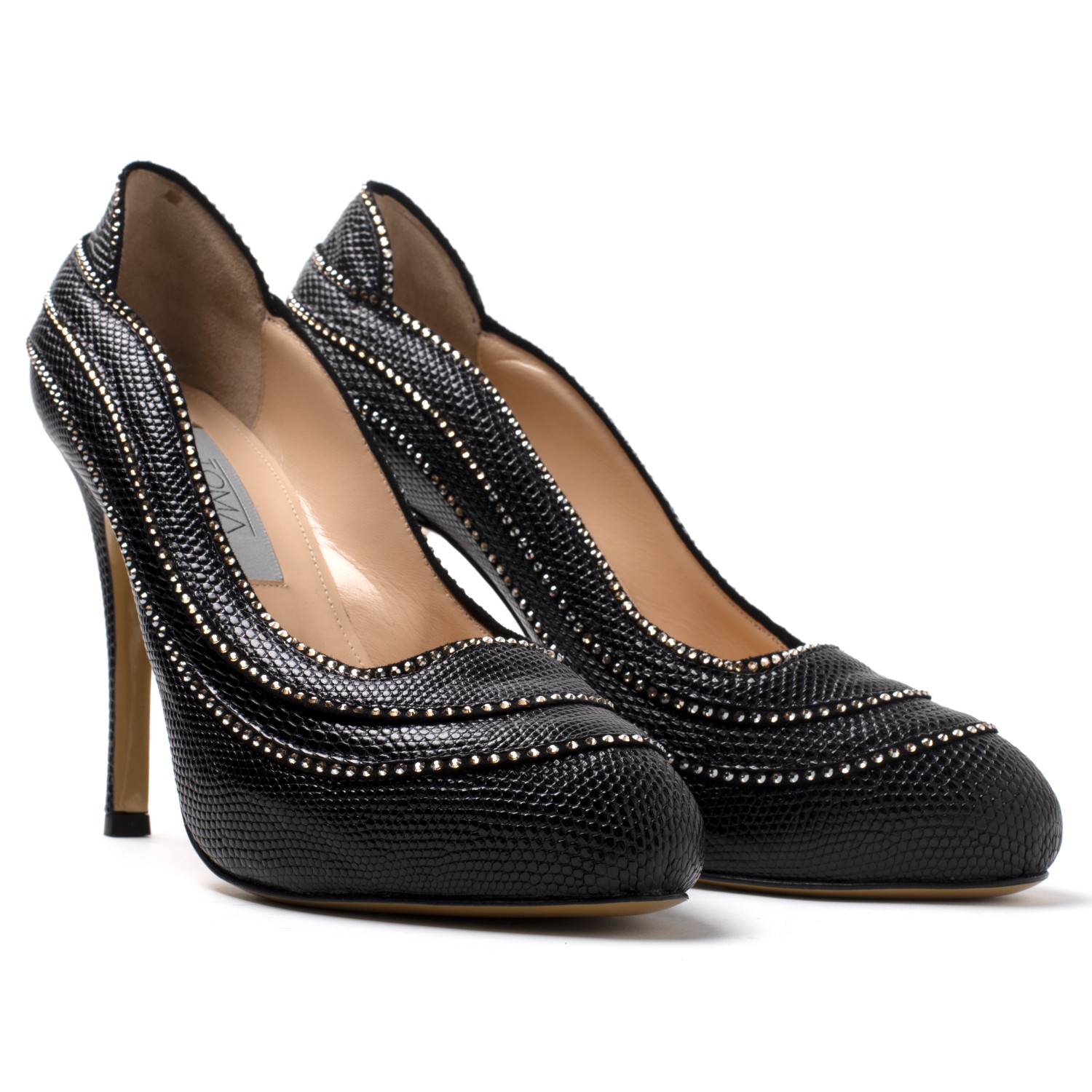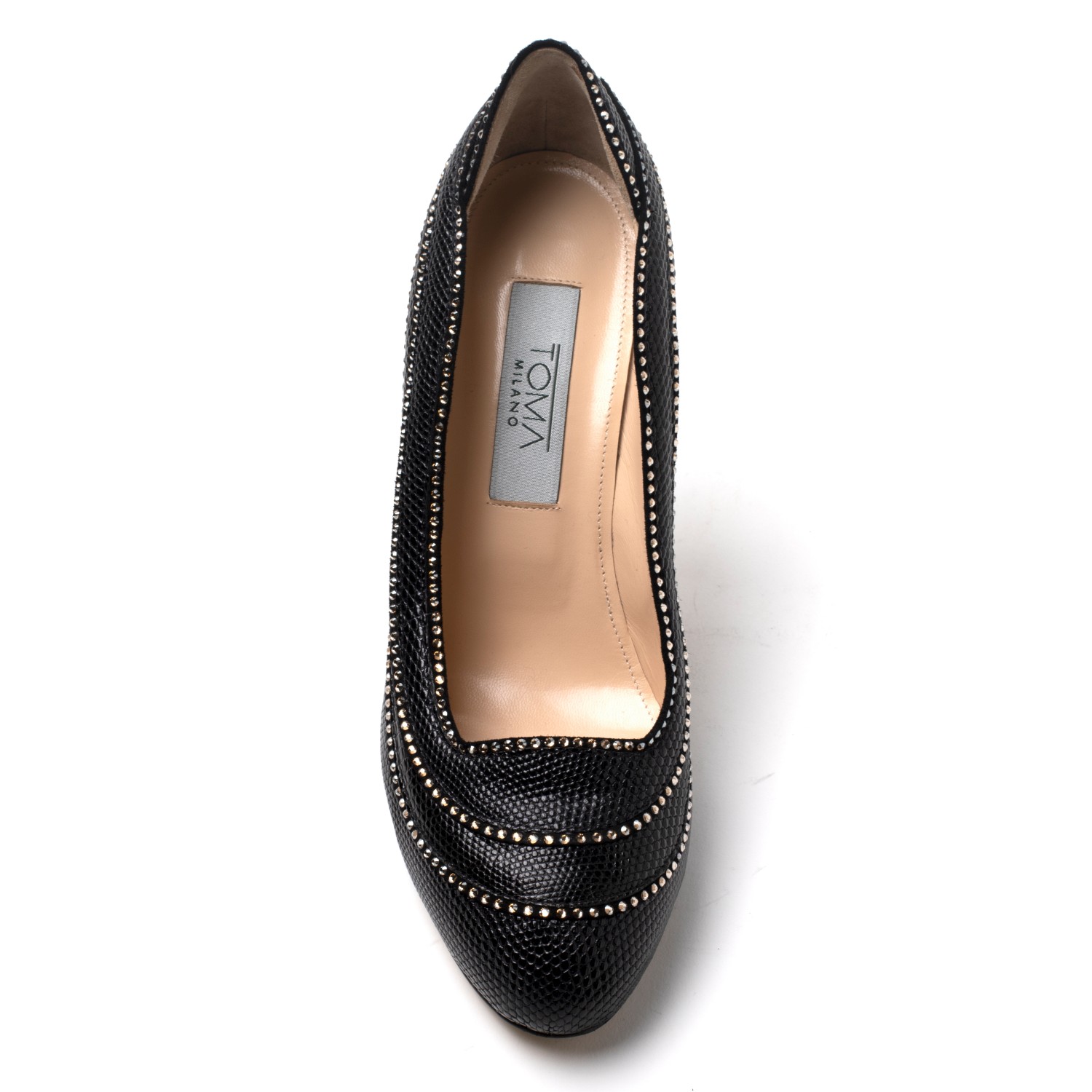 L’iconica creazione della Maison TOMA stile inconfondibile che riflette eleganza e femminilità, realizzata in pregiata pelle di varanus, si distingue per il disegno ad onde definite dalle linee luminose dei cristalli Swarovski. Punta arrotondata con plateau interno e tacco a stiletto. Made in Italy